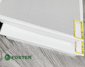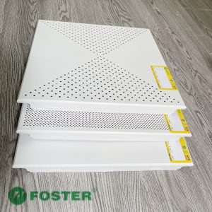 Trần nhôm Foster Clip-in 300×300 bề mặt được đục lỗ và được trang bị một lớp vải không dệt để kiểm soát âm thanh và giảm tiếng ồn.